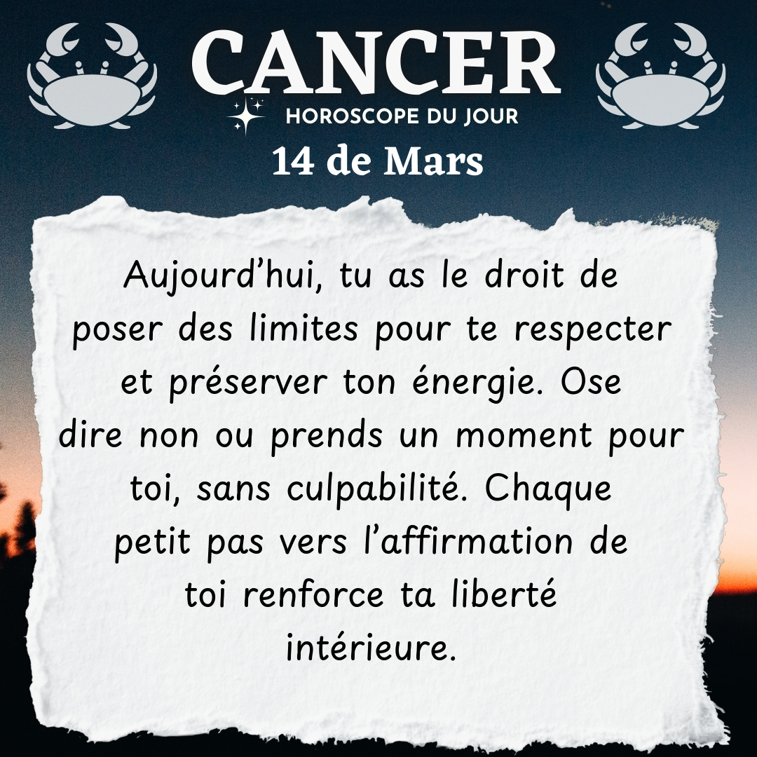 ♋ Cancer aujourd'hui Samedi 14 du Mars